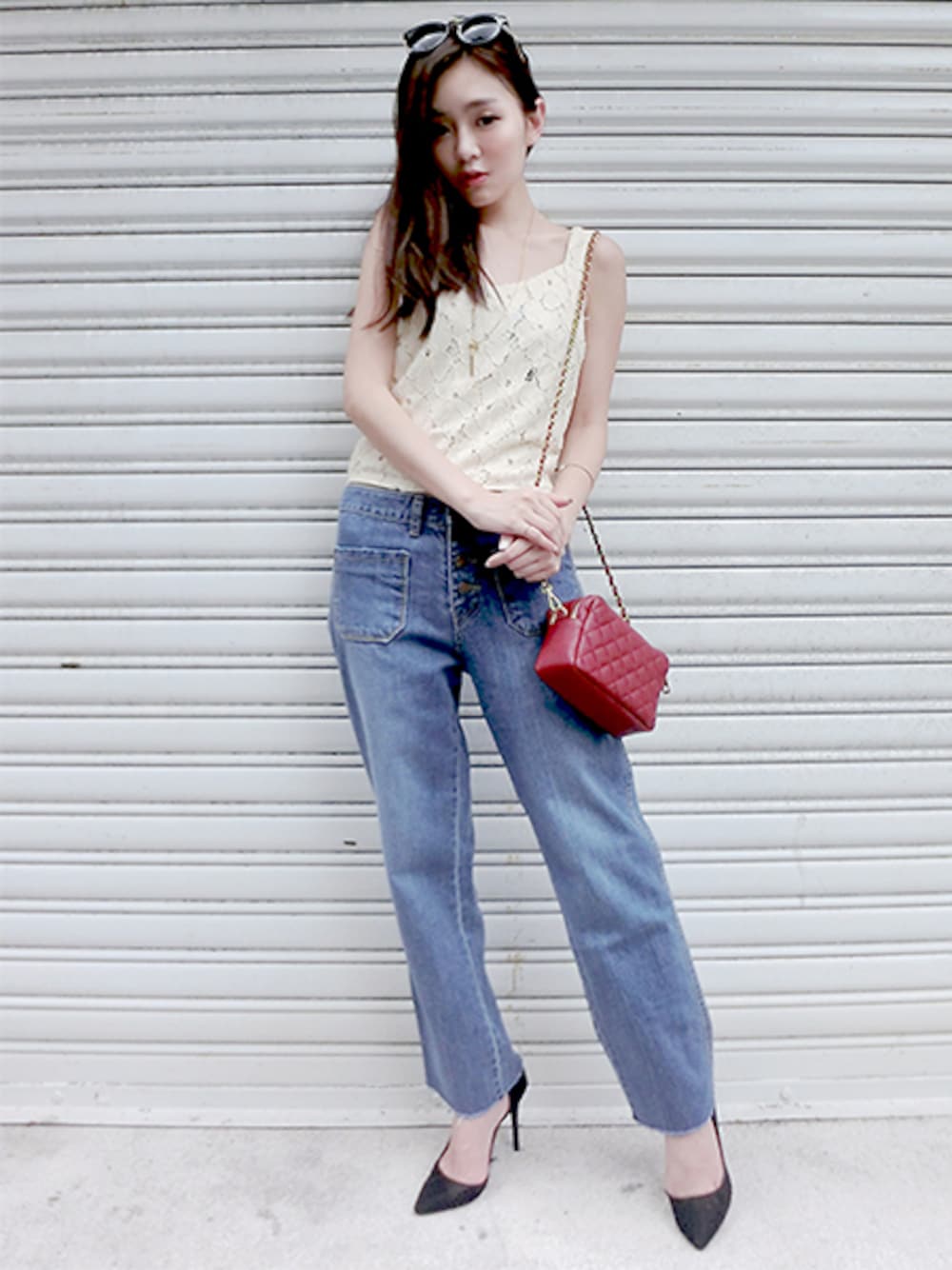 Queenie 子翎 復古性感Look old school的造型時下正流行!! 短版剪裁的蕾絲背心 配上復古寬版微喇叭牛仔褲 再搭個紅色格紋包和黑色低跟鞋 真的是復古又性感呀