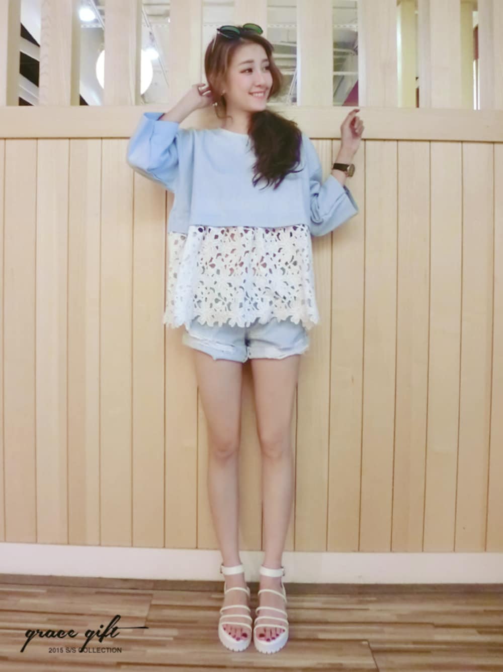 兔美 Wusami 低調的甜美look 粉藍色的上衣 配上特殊剪裁的蕾絲衣襬微微透出肌膚 簡單搭配牛仔短褲 讓上衣寬鬆的設計使腿型看起來更修飾更纖細 穿上白色厚底鞋 露出剛擦上的新指甲油 點出腳上的小亮點 不太不引人注意卻又那麼重要的存在 一整天的心情也因為小確幸隨之好了起來~~