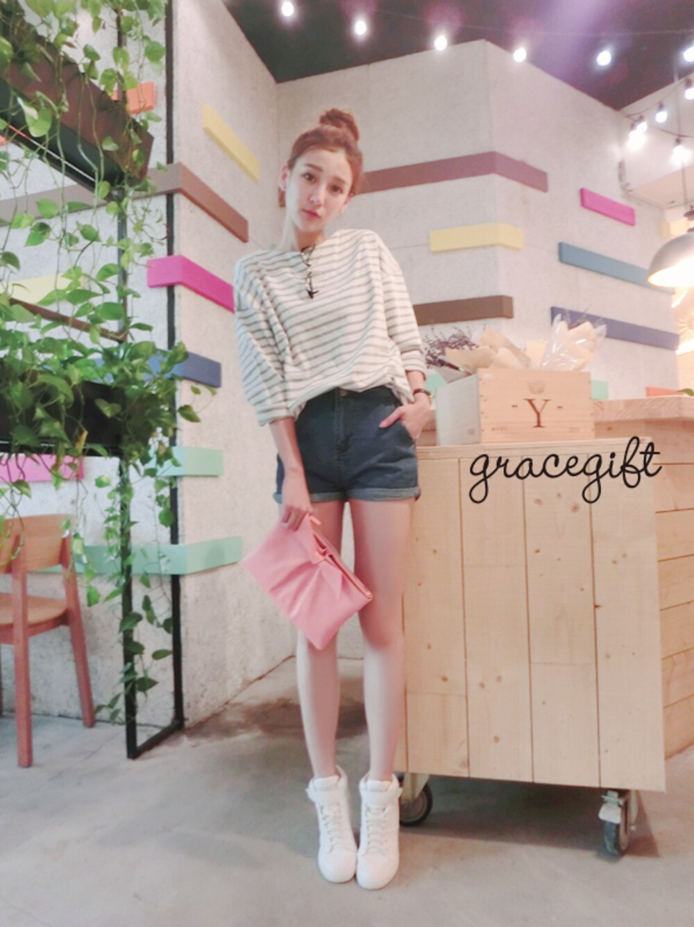 兔美 Wusami 甜甜又帥氣 簡單的條紋T-shirt 搭配高腰牛仔短褲 把上衣扎進去一點呈現的縐褶感 俏皮又可愛 穿上內增高mickey休閒鞋 瞬間拉長腿的比例 讓你在慵懶休閒之餘 還能擁有model的氣勢