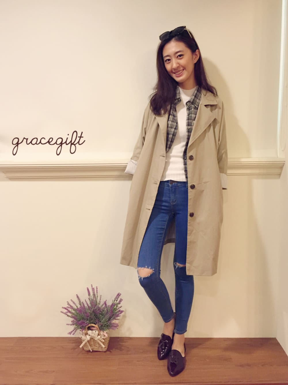 Gracegift Staff's #OOTD 去韓國採購的時候 韓國的歐妮都會這樣穿!!! 風衣外套內再搭一件格子襯衫 風衣的袖子一定要反折 這種多層次的穿搭法女孩一定要學起來 讓風衣穿搭有了不一樣的呈現方法 另外腳上這雙流蘇側鏤空樂福鞋 小編也大推!!! 穿起來很修飾腳板 復古的造型超好看 搭配什麼都match