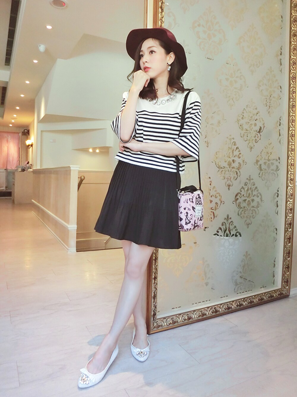 Sarina小萬 貝兒玫瑰寶石平底鞋穿搭 簡單的寶石綴飾的針織上衣 搭配甜美雪紡百褶短裙 再穿上也有寶石裝飾的貝兒玫瑰寶石平底鞋 完全散發輕熟女的微甜微熟感 怕太過成熟 所以在耳環上下點功夫 用可愛的愛麗絲點綴 保有少女心的俏皮感