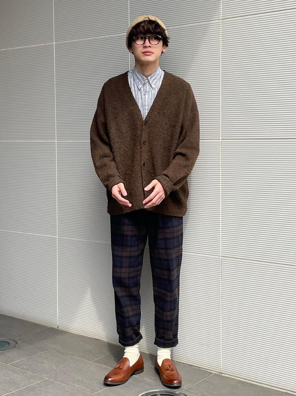 チェック×チェックのトラッドコーデ 全体的に大人な色味で揃えつつ、シャツは明るいブルーのチェック柄が映える組み合わせ◎ さりげないパンツのチェックと合わせて一癖あるコーデに。