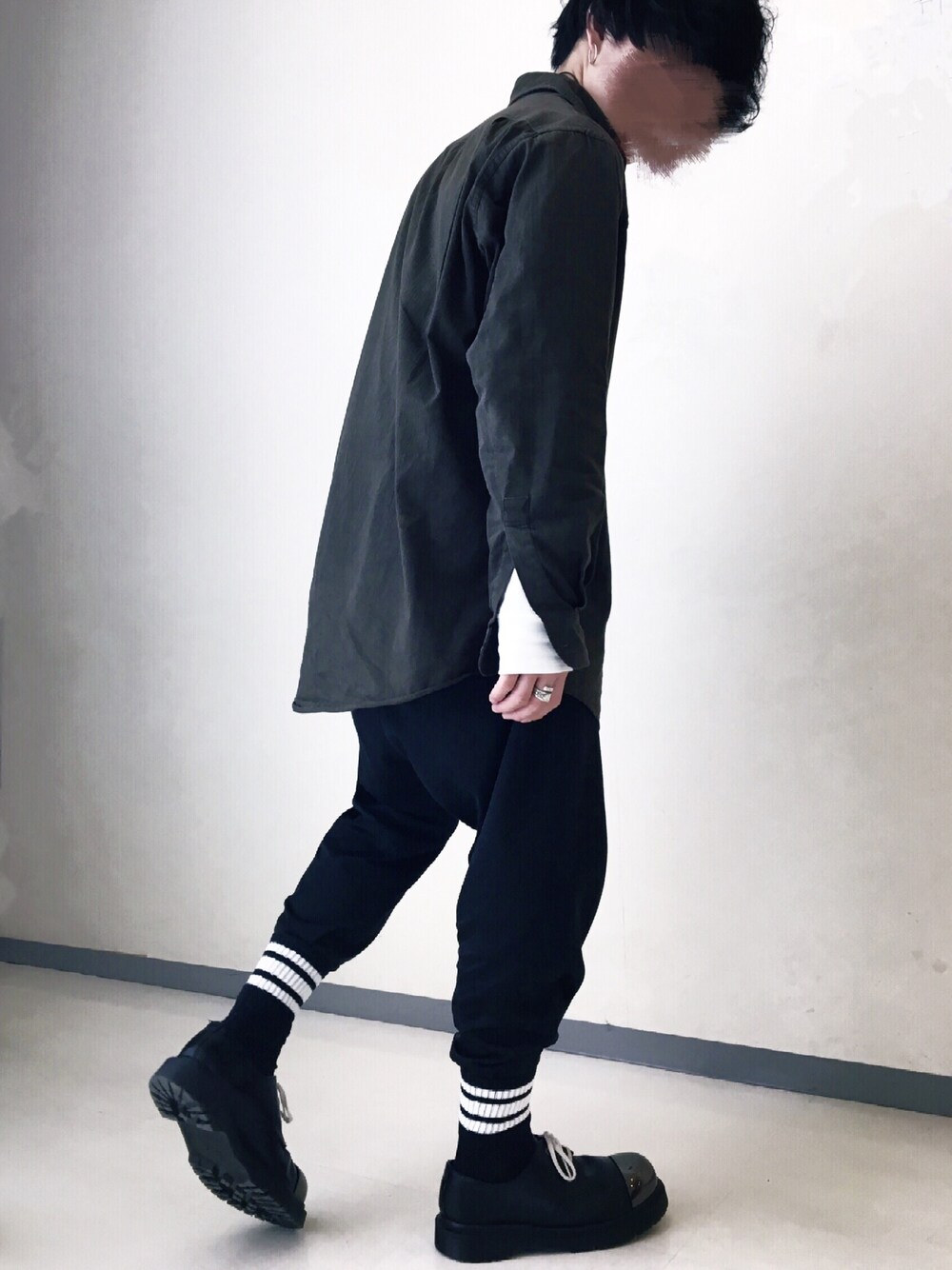 こんばんは。 久しぶりの投稿😫 ラインソックスをギャルソンのジャージパンツにインしてみました! 思いの外いい感じでした🤤 Y'sのビックシャツはめっちゃ気に入ってるんですけど、仕事でブリーチしちゃいました、、、