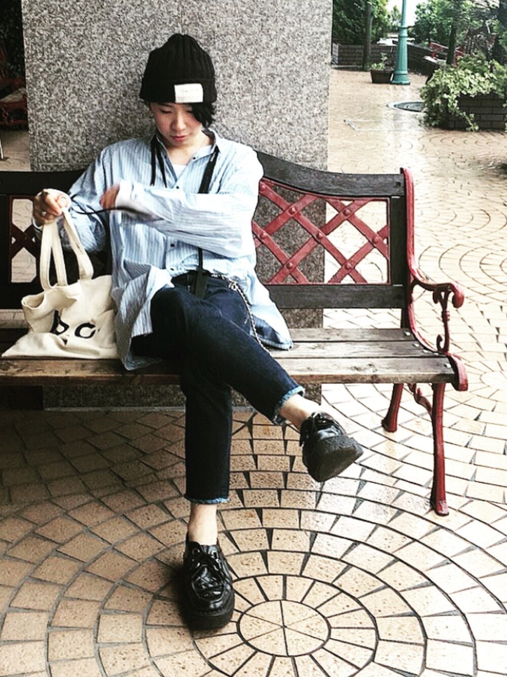 こんばんは。 ストライプシャツにデニムという清潔感狙いのコーデです。笑 たまに行くサンドイッチ屋さんの前のベンチにて。