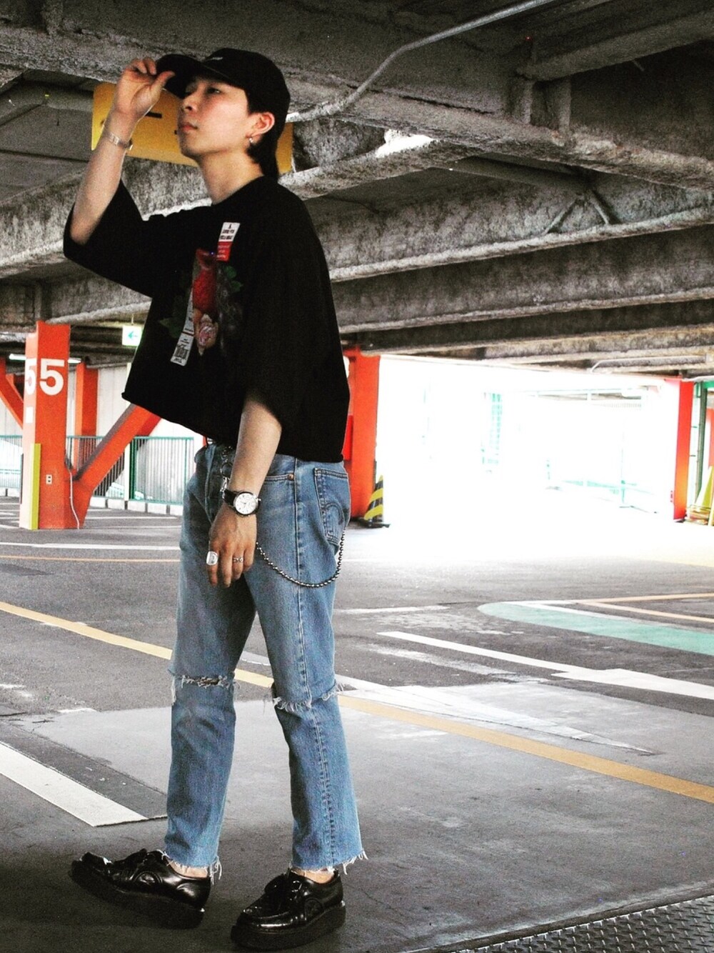 こんばんは。 oldparkのデニム買いました。再構築デニムです☺️ doubleのTシャツと相性抜群でした◎