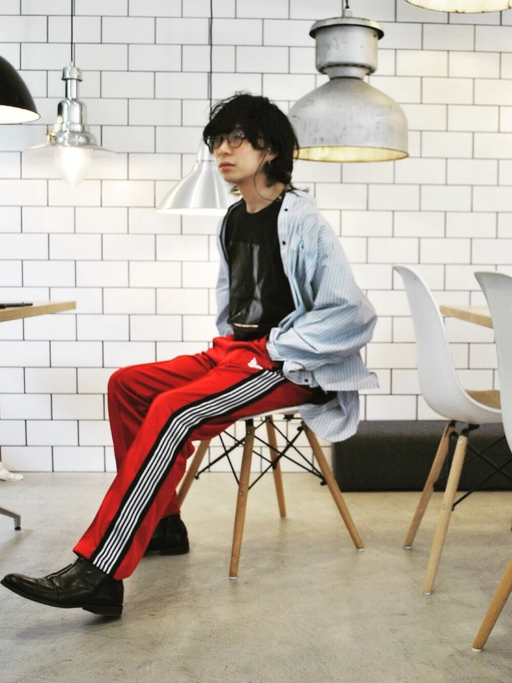 地元のオシャレなカフェにて。笑 トラックパンツはやっぱり赤が使いやすい! jiedaのシャツは形に飽きたのと下の方が汚れてしまったのでいい感じの丈にちょん切りました👶 Instagram→@ryotainoue_21