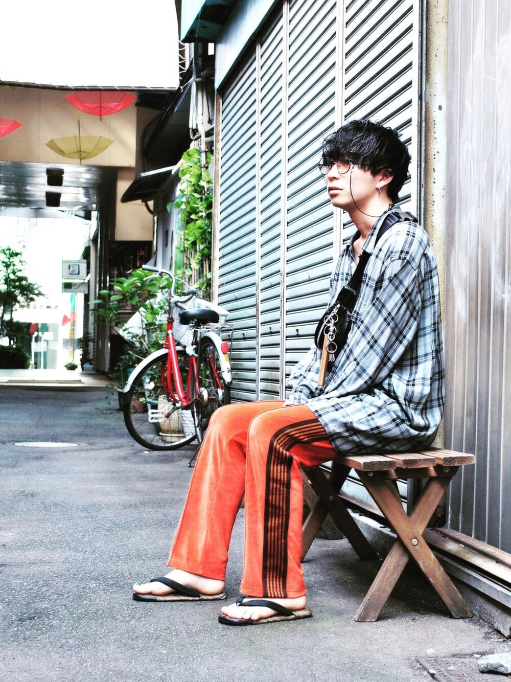 古着のてるチェックシャツにとneedlesの合わまぁまぁ派手やけど良かったな😂 久しぶりグラスコードとウエストポーチ着用。笑 Instagram→@ryotainoue_21