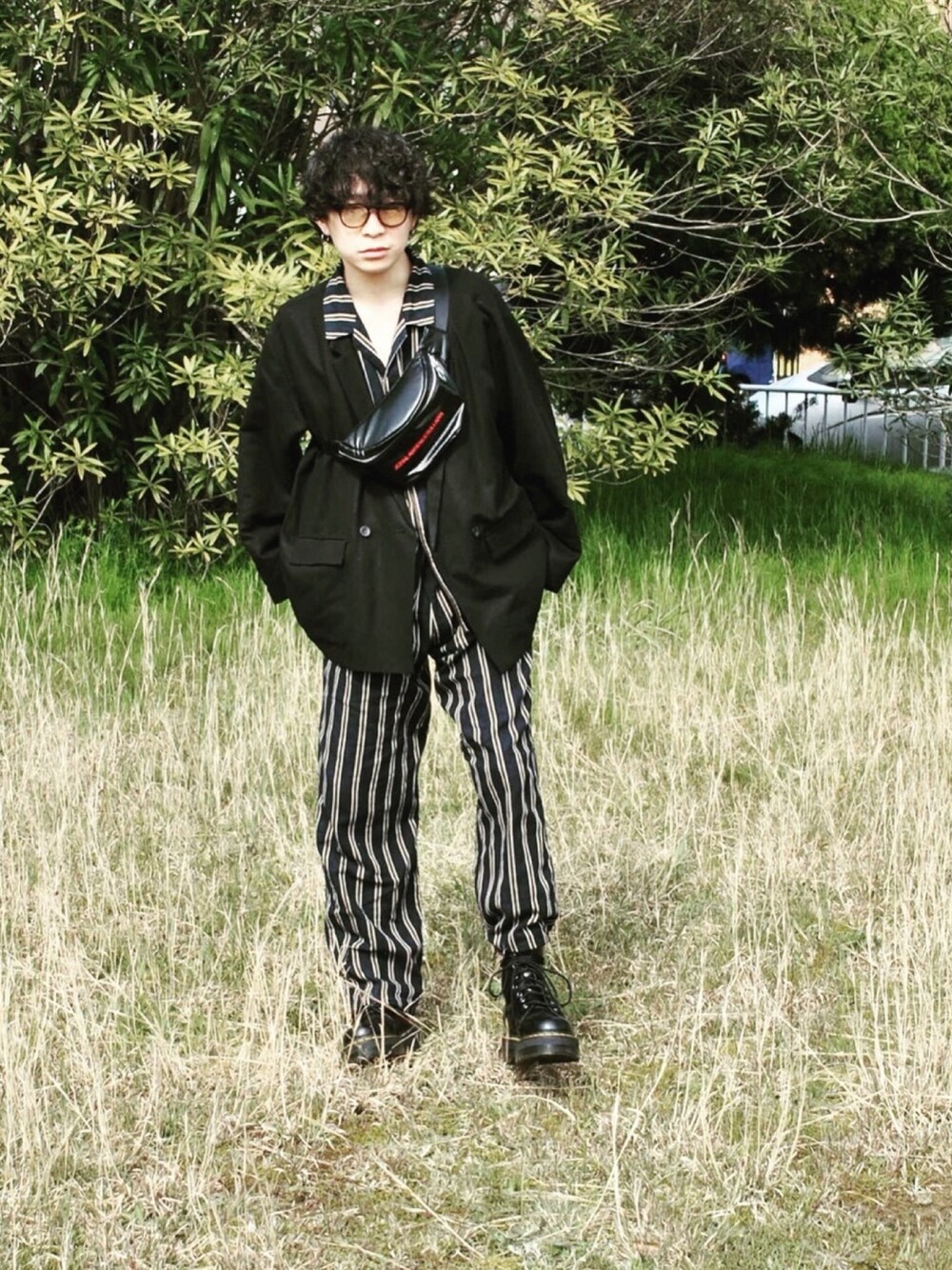 ヴィンテージのYves Saint Laurentのパジャマを購入。 上にジャケット羽織り、片方ブーツインでちょい気だるさを出しました💁♂️ Instagram→@ryotainoue_21 プロフィールから飛べます!