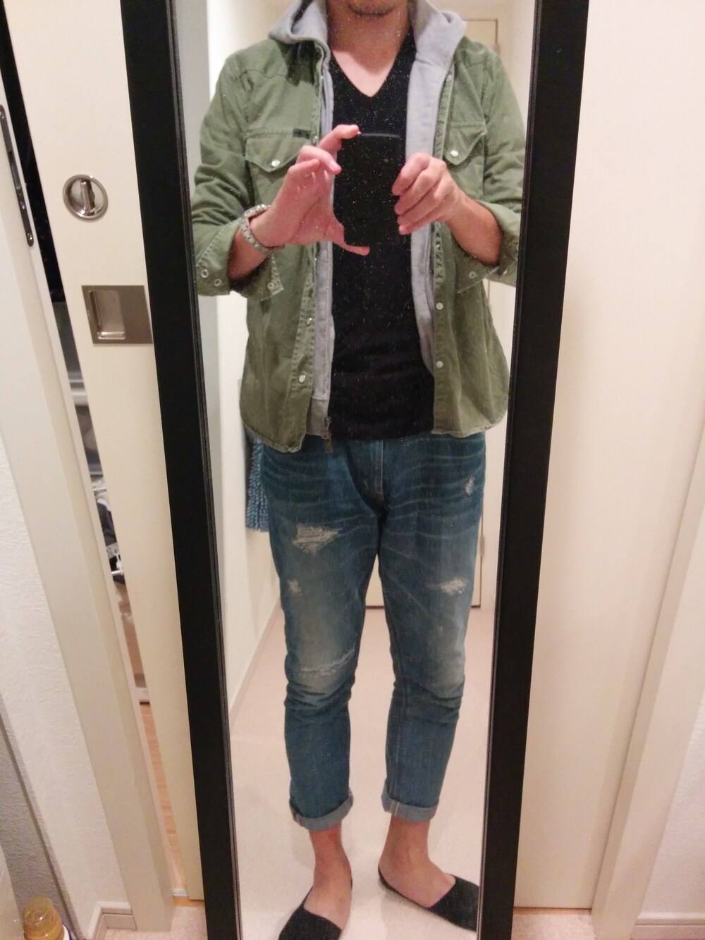 東京は大分寒いのでパーカーにミリタリーシャツ。 久々の休み。