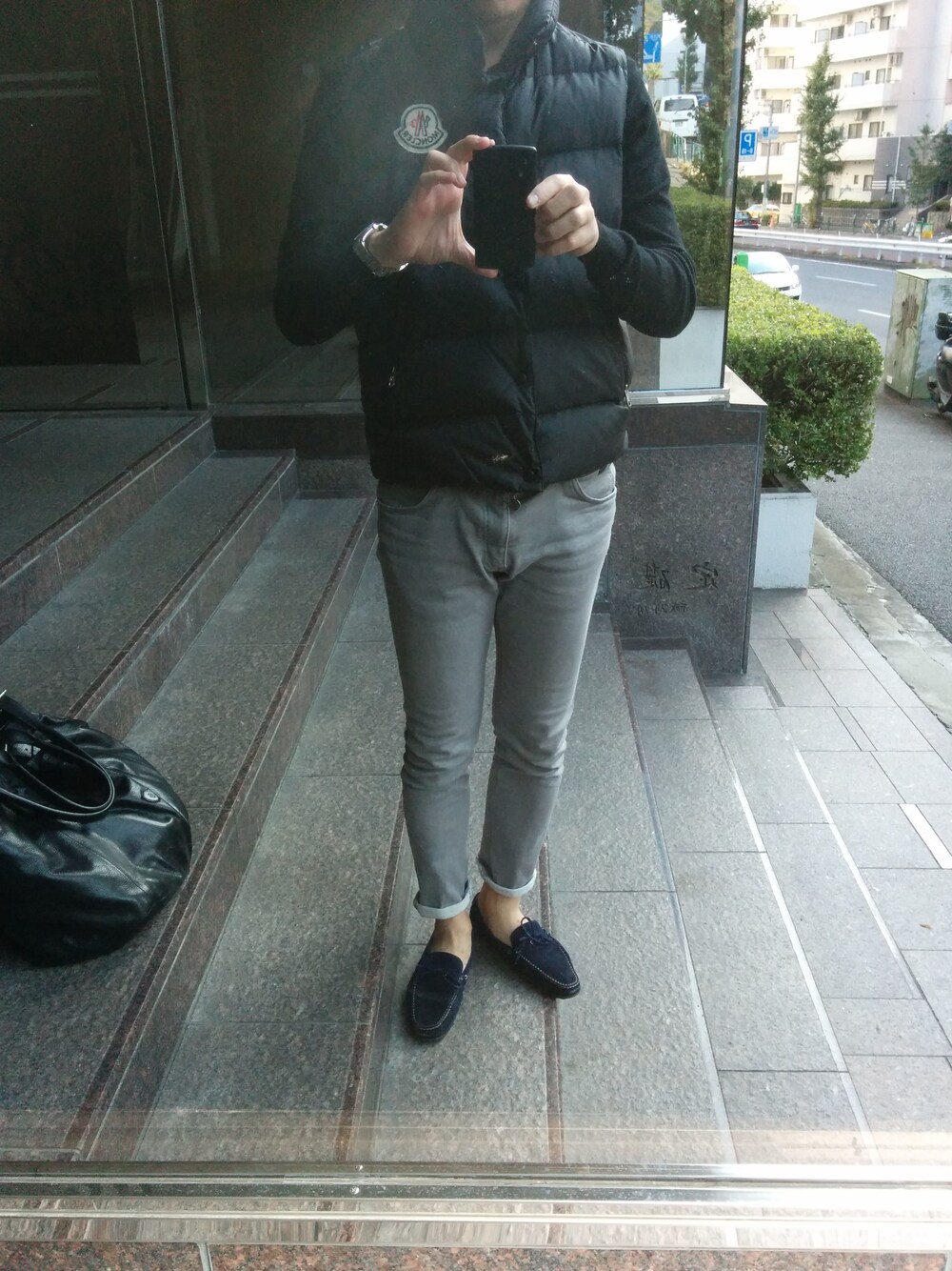 寒いのでモンクレールのダウンベスト。 ニットは無印(毎冬4色買い換える)。 パンツはナノユニバース。