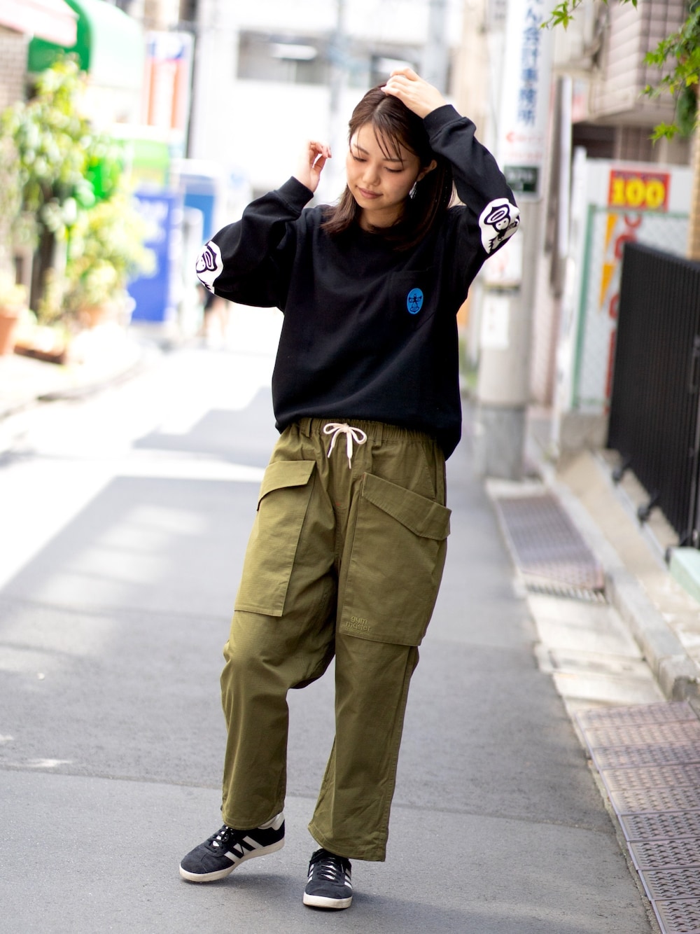 チラ見してるヒジにはレスラーのプリントが! 後姿のインパクトは間違いなしです! 前は胸ポケットにレスラー🤼♀️ モンスターポケットのパンツも可愛い💚