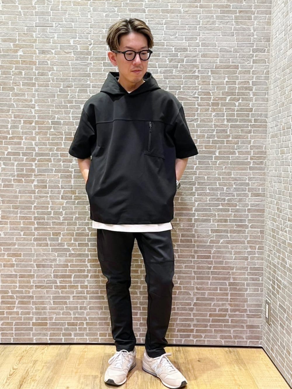 同素材のパンツと合わせたスポーツテイストのセットアップスタイルにしています。インナーシューズをホワイトにしてアクセントに