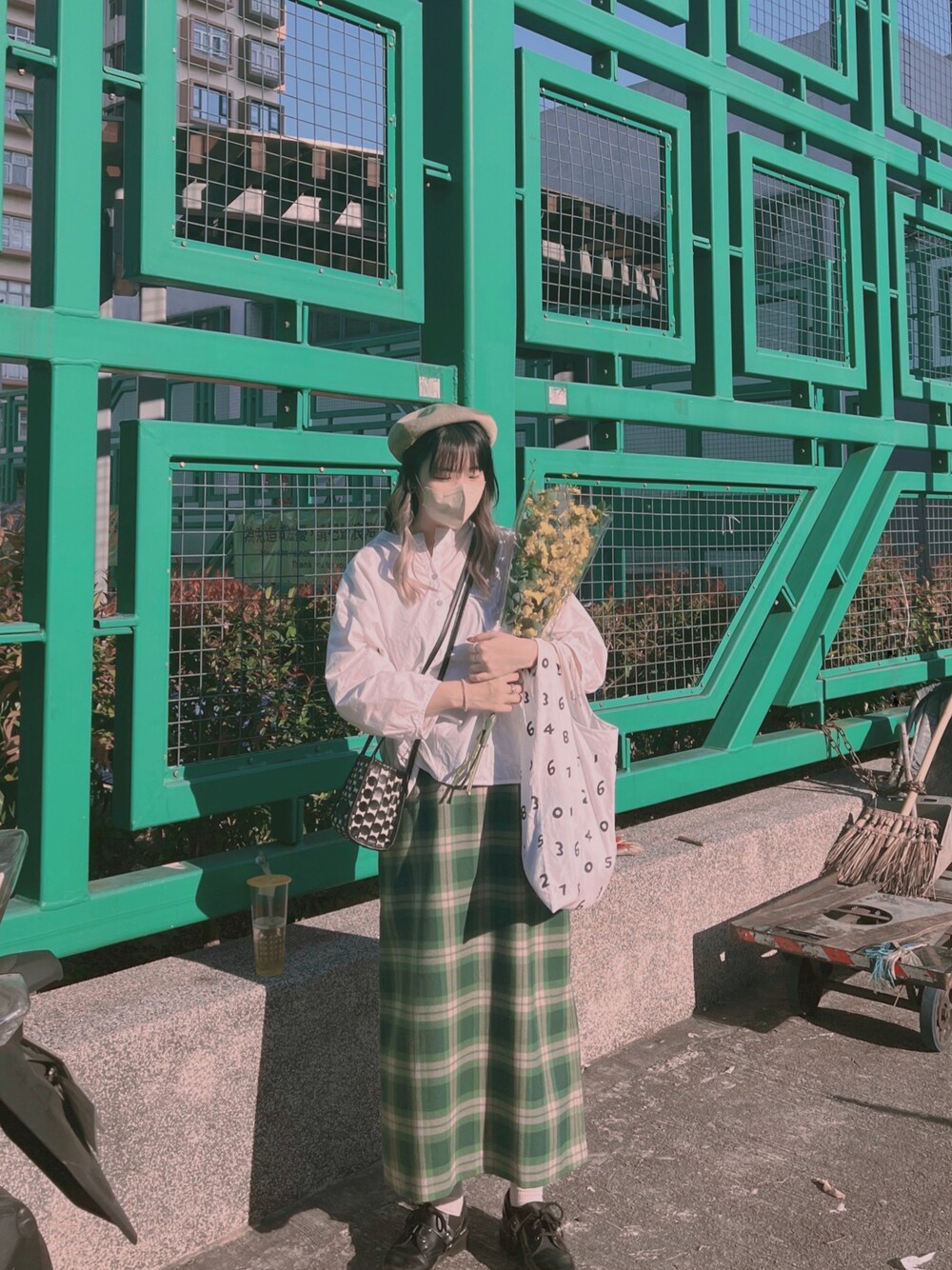 グリーン系のスカート、ブラック系のバッグを着用したレディースの春コーディネートの1枚目の写真
