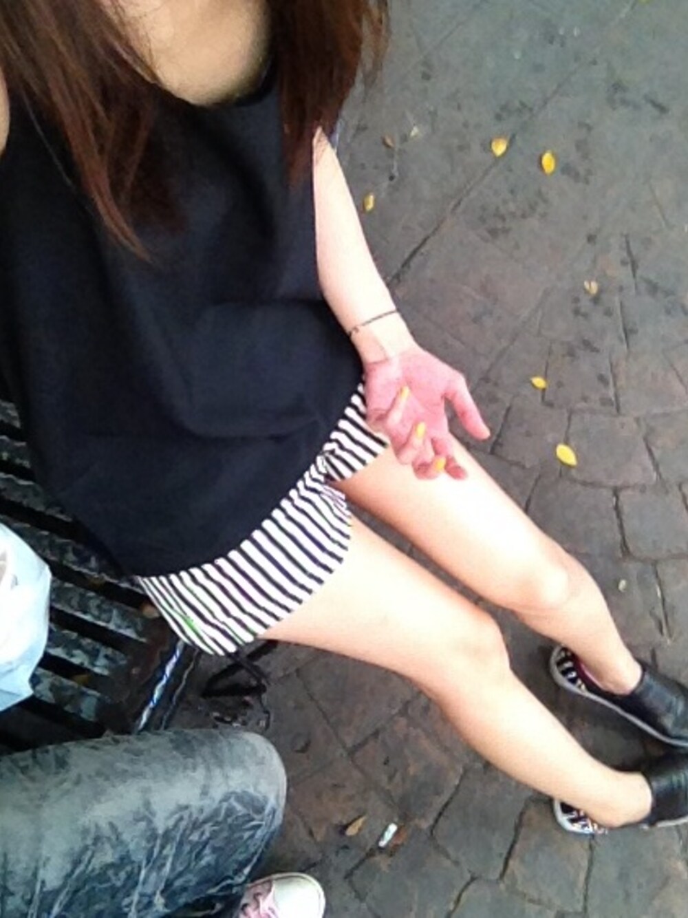 A'Lady 時髦個性LOVE愛心電繡簡約背心 Life8 英倫風簡約感直條紋短褲 MIZZUE 黑色仿皮石頭紋鉚釘休閒鞋 指甲油為UNT自己的旅行系列 精靈的短髮RU005 還有搭牛仔襯衫外套,太熱沒穿