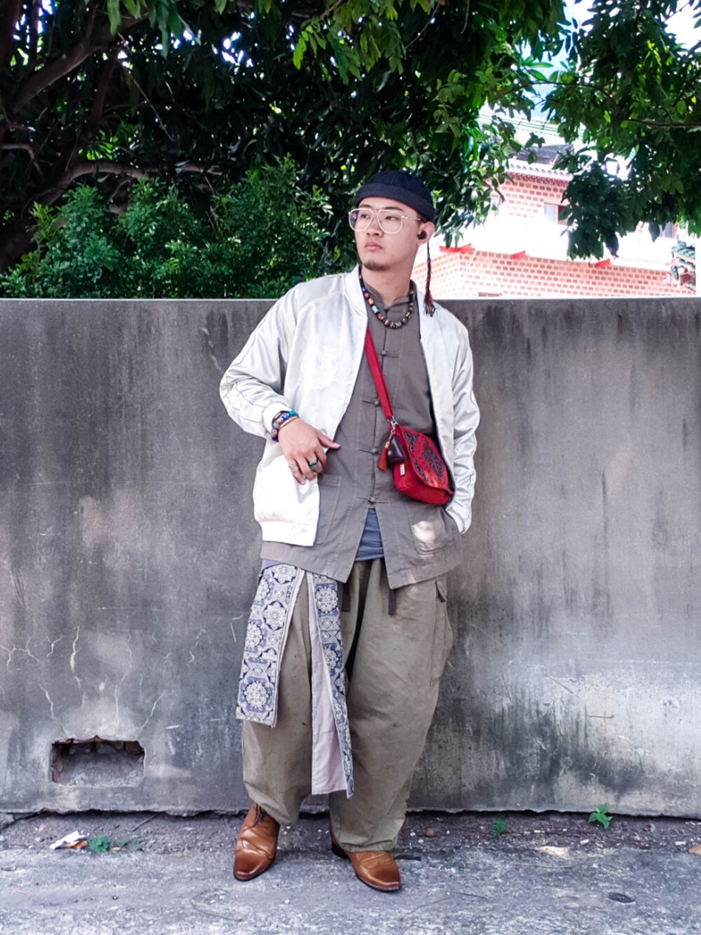從綠島回來的第一篇穿搭 同色系得唐裝褲子搭配會讓其他顏色變的顯眼,比如紅色的包包跟白色的外套跟棕色的皮鞋,這是很好讓配件層次凸出的一個方式。 / 這套外套跟堂裝的領口搭配是一個很不錯的搭配細節,立領堂裝跟橫綱外套的領口在搭配的時候視覺效果比起一般的襯衫領子更適合。 / Hat: no brand Outer: vintage Inner: no brand Pant: @unique_select Bag: no brand 腰布: no brand Shoes: no brand Model: @gray_humer
