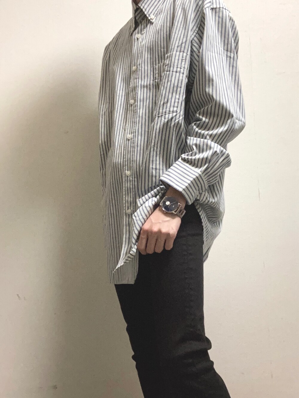 ユニクロUのワイドフィットストライプシャツ×ユニクロ黒スキニー キレイめなシルエットで着こなすことができるところが良き MVMTの腕時計もめちゃくちゃ気に入ってます