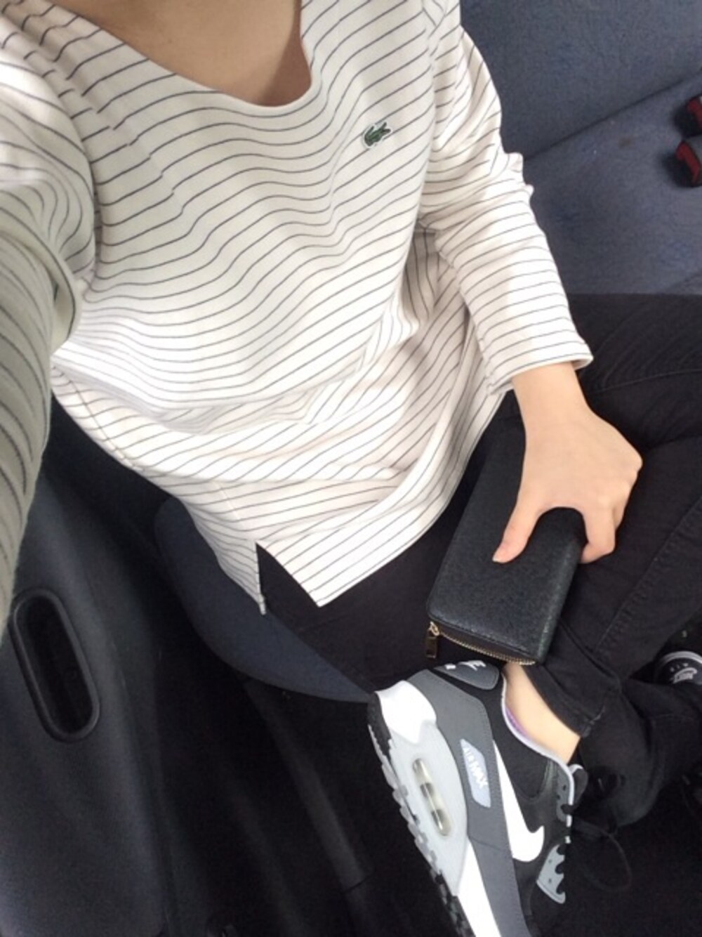 ホワイト系のTシャツ/カットソー、ブラック系のスニーカーを着用したレディースの秋コーディネートの1枚目の写真