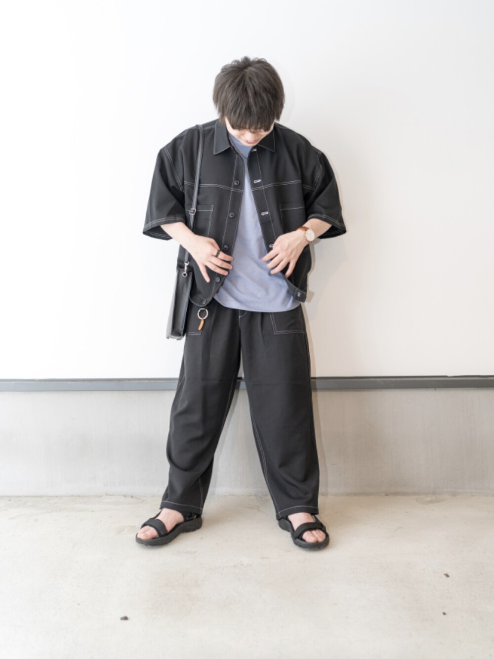 すーのセットアップ「<セットアップ>T/R ストレッチ オーバーサイズ ステッチ CPOシャツジャケット&ベイカーワイドアンクルパンツ」を使ったコーディネート