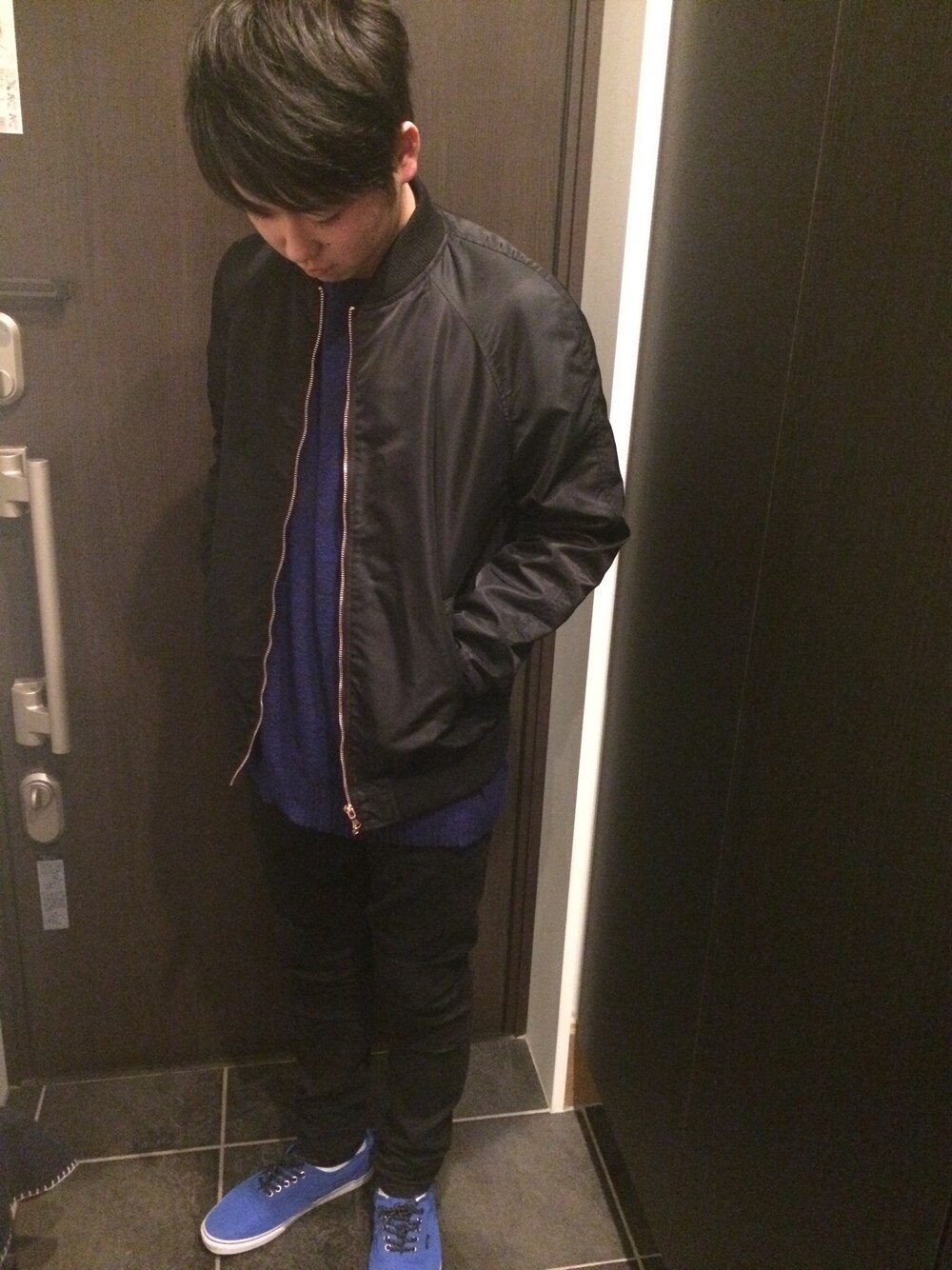 ブルー系のニット/セーター、ブルー系のシューズを着用したメンズの冬コーディネートの1枚目の写真