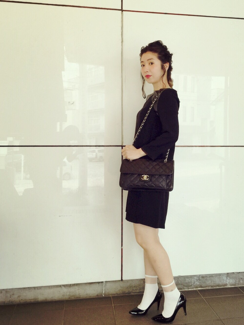 ブラック系のパンプスを着用したレディースの春コーディネートの1枚目の写真