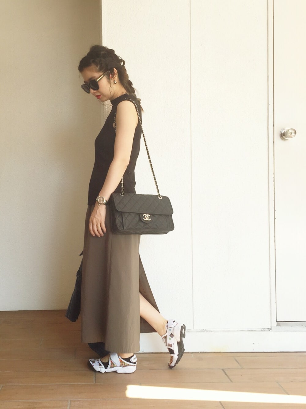 ホワイト系のスニーカーを着用したレディースの夏コーディネートの1枚目の写真