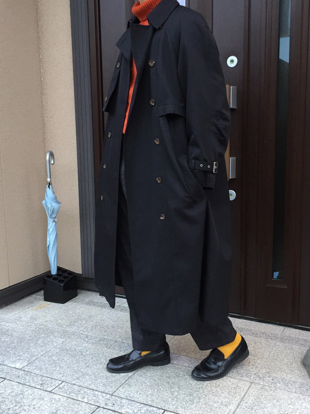 . . 黒のロングコートってボタンあればあるほど個性あっていいよねー