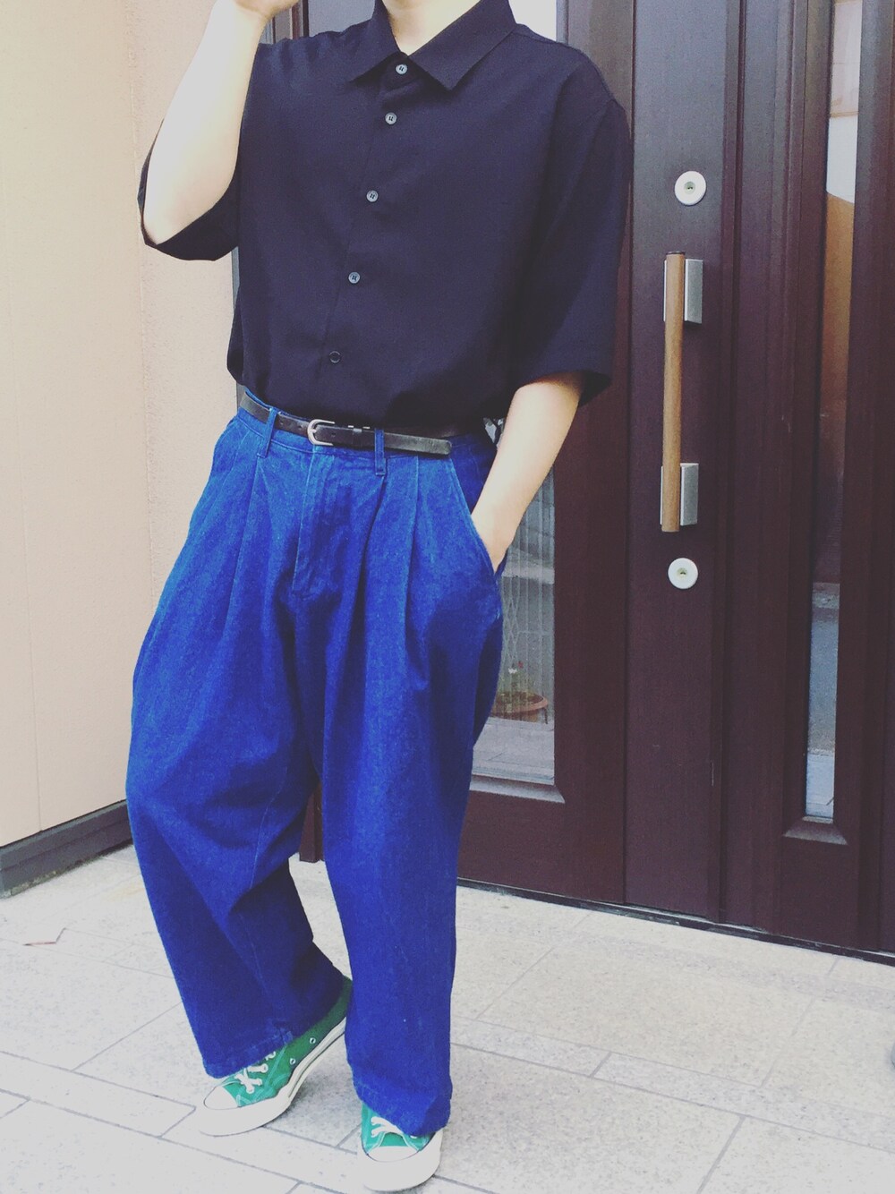 ブラック系のシャツ/ブラウス、ブルー系のデニムパンツ、グリーン系のスニーカーを着用したメンズの春コーディネートの1枚目の写真