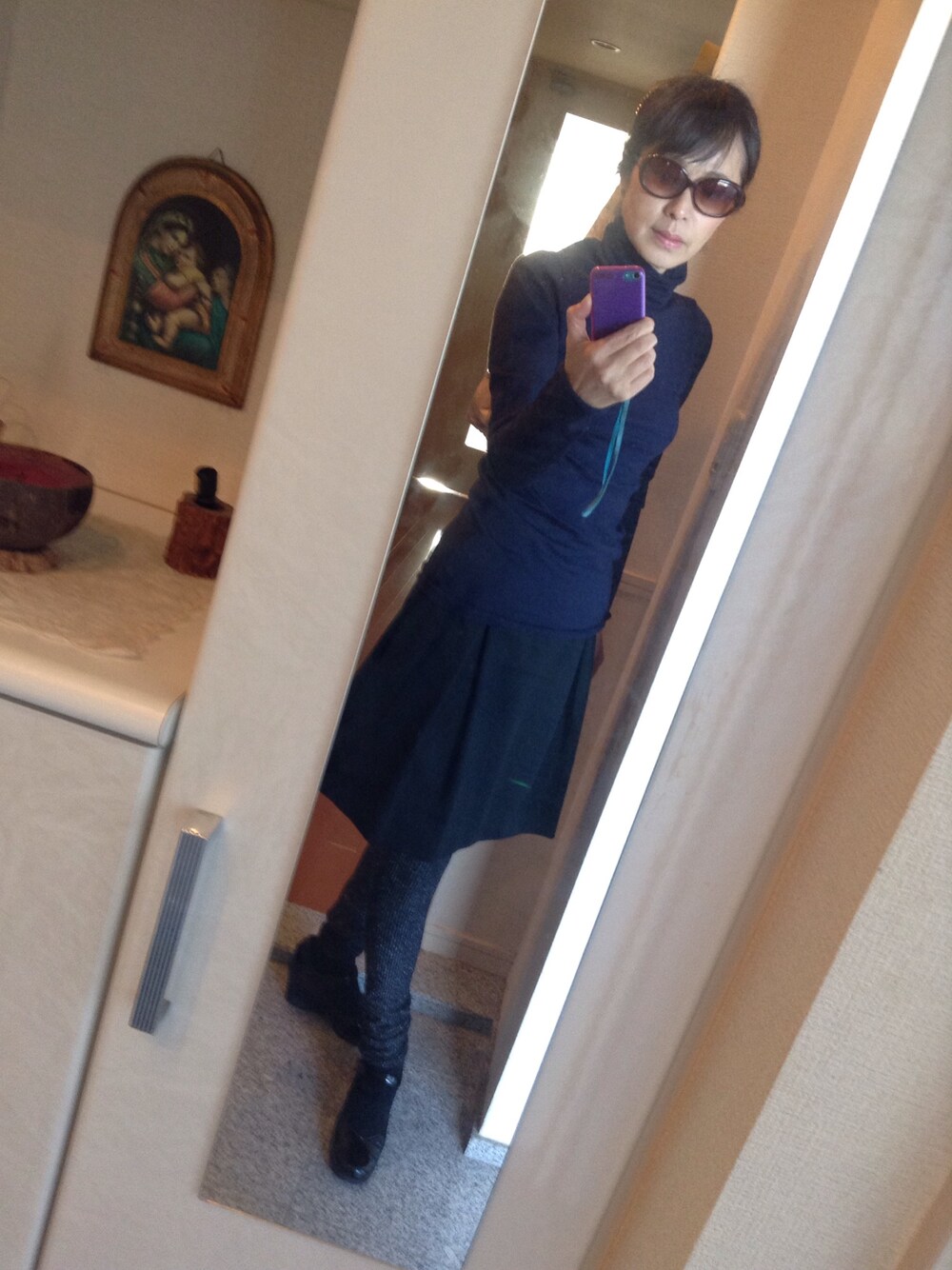 私の鉄板アイテム、マリードールのタートルは、着心地が良くて、何にでも、合わせられます。 上下地味目なので、ラメ入りの12分丈レギンスを履いてます。暖かいのでブーツは不要、ハイヒールで軽やかに歩きますよ。