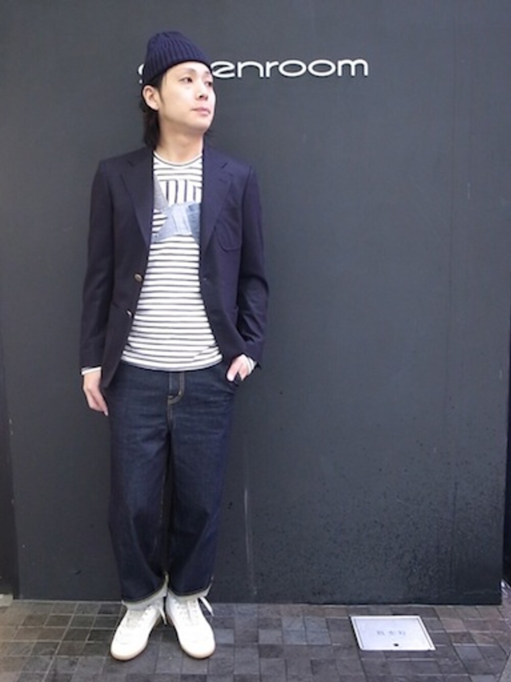 KIJIMA TAKAYUKI Knit Cap ¥7,350-(TAX込) RAINMAKER BLAZER ¥71,400-(TAX込) JUNYA WATANABE COMMEdesGARCONS MAN 綿天竺ボーダー 製品加工 L/S ¥25,200-(TAX込) DIGAWEL WIDE DENIM PANTS ¥18,900-(TAX込) Maison Martin Margiela LEATHER MID CUT SNEAKER ¥82,950-(TAX込)