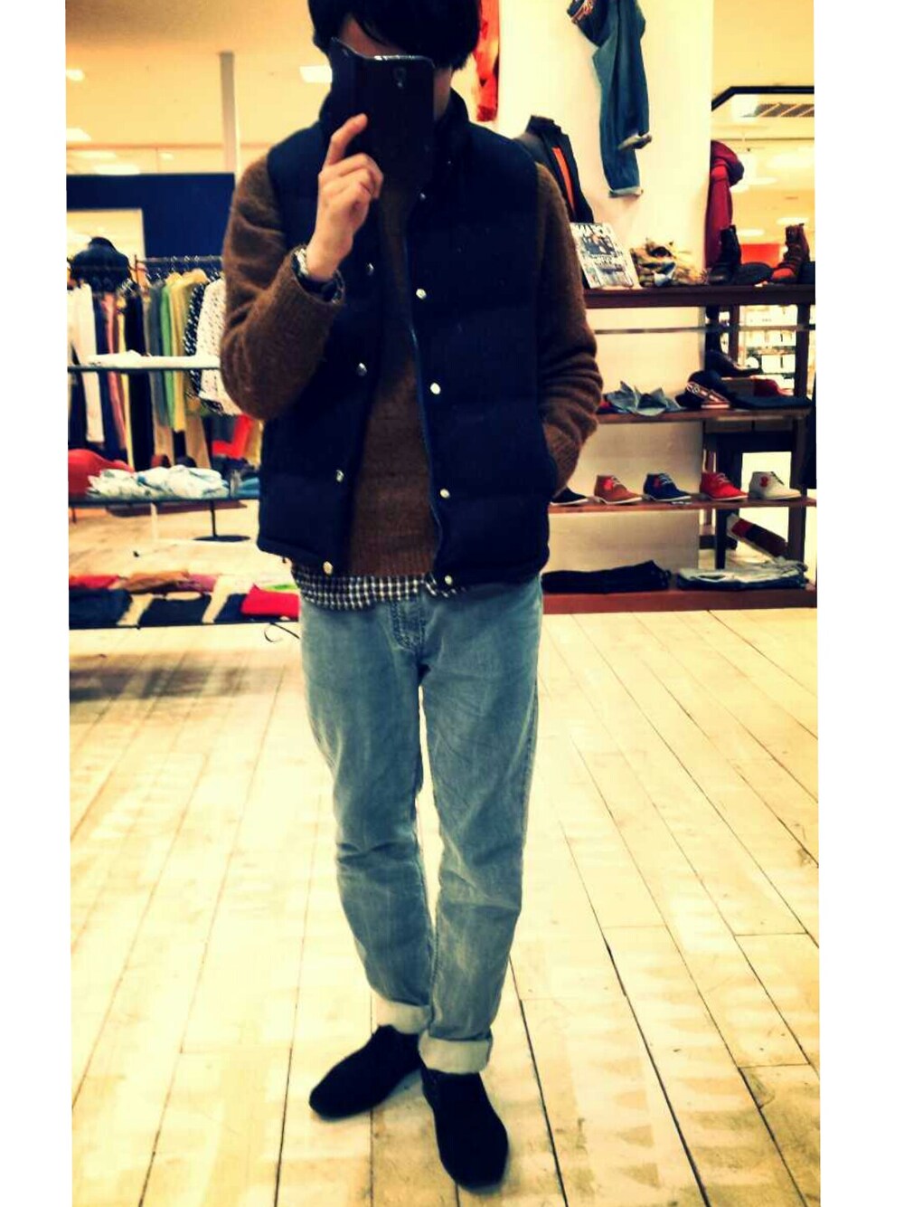 ダウンベスト シャギードッグニット グレーデニム オペラシューズ パンツ太め