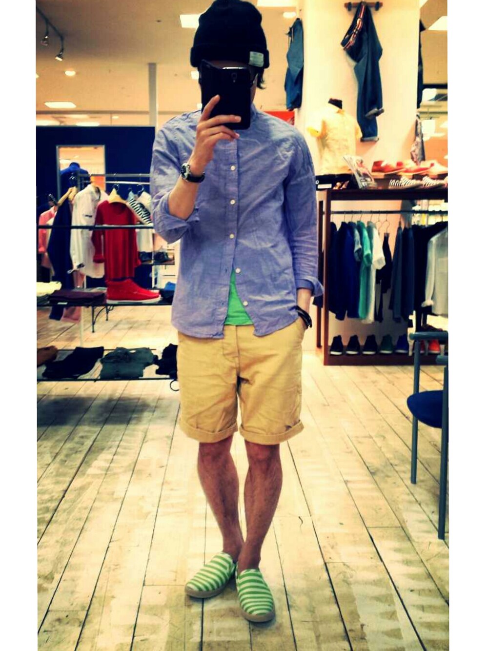 ロング麻シャツ ショーツ ボーダースリッポン 上までボタンとめてます。 分かりづらいですけど、シャツの色パープルです。