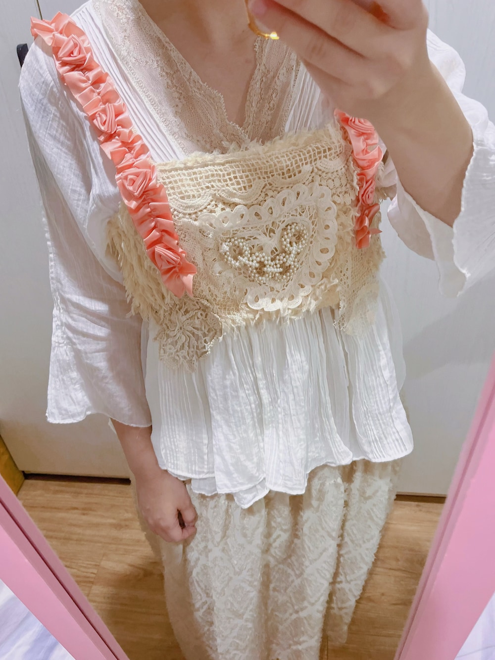 👒 今日的穿 | Remake 背心 最近迷上了帶點手作感的穿搭元素 立體的玫瑰花肩帶、滿滿的蕾絲拼接,加上愛心形狀的珍珠✨每個細節都太美了。 搭配: ☁️ 一件寬鬆的純白壓紋上衣,柔軟的面料讓整體更有空氣感。 🪶 下身選了象牙白的羽毛緹花長裙,呼應背心的復古感。