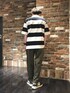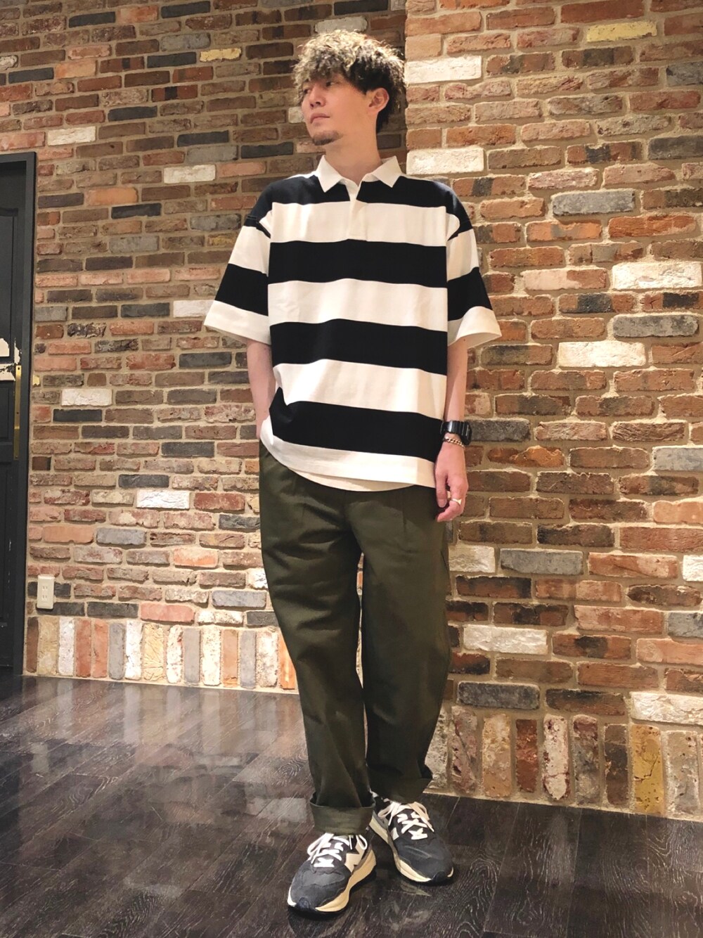 ボーダーのラガシャツを使ったカジュアルコーデ。