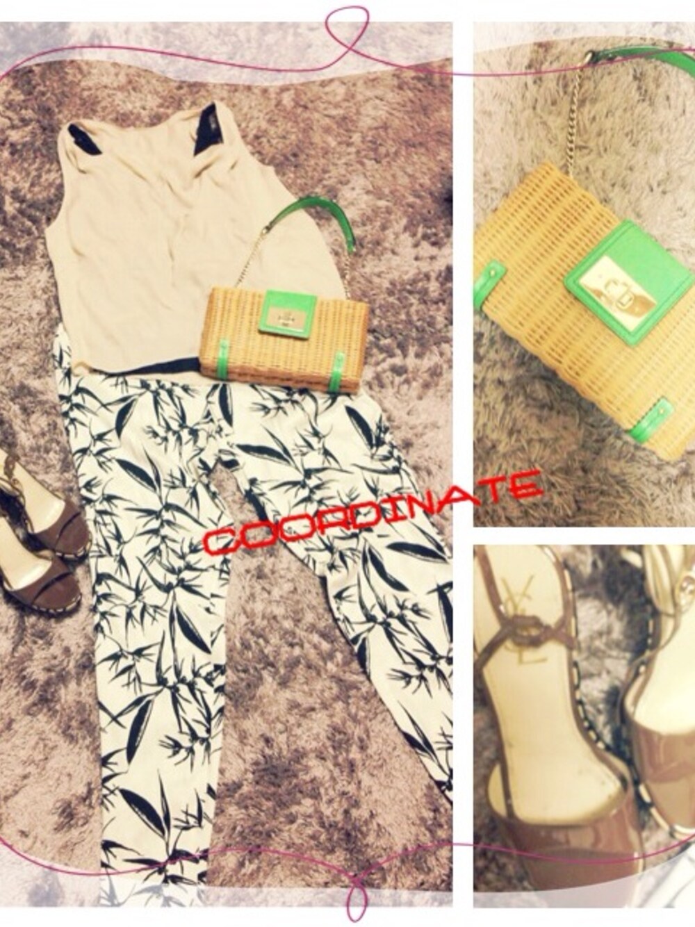Black&White ボタニカルサルエル 足元は、高めヒールで♥️ カバンはネオンで遊びプラス♥️