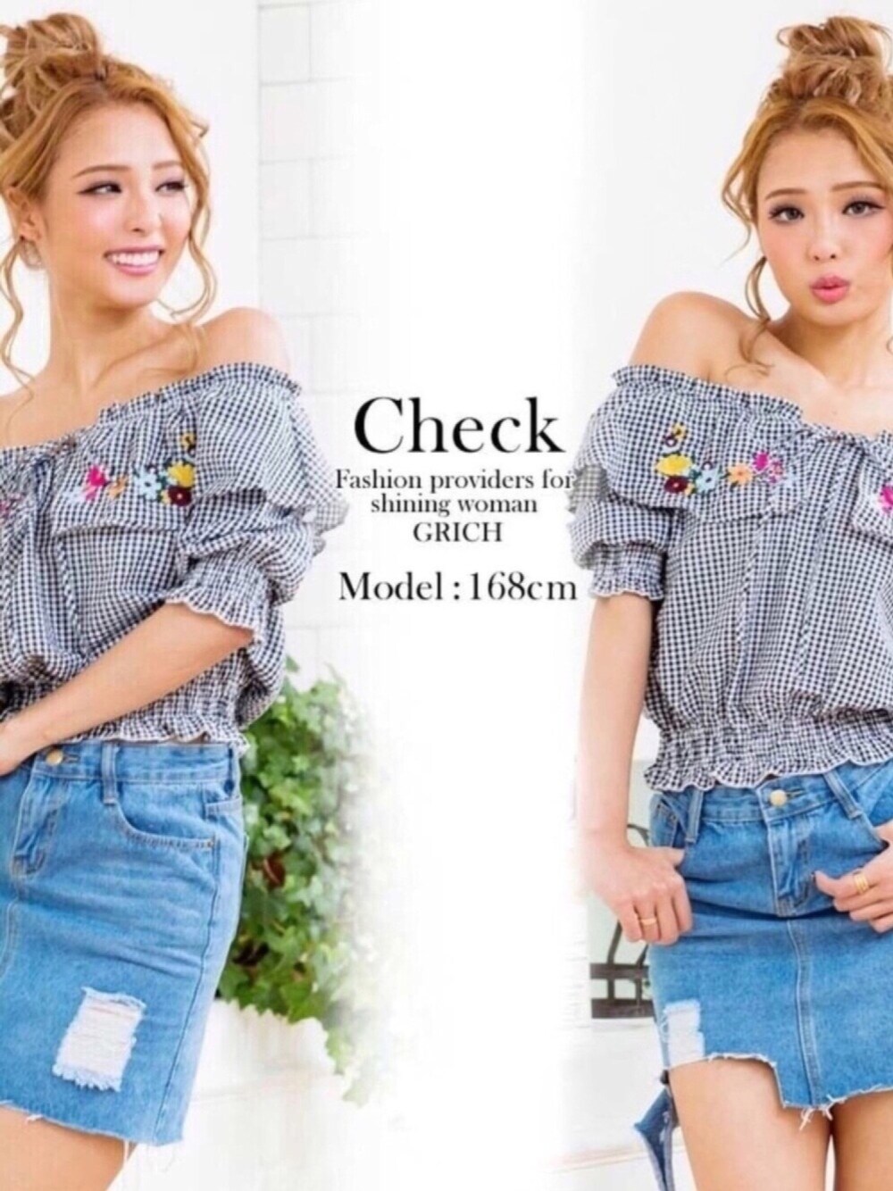 ◆レディの大好きが集まった一枚🌼 (ギンガムチェック/ホワイト) 【フラワー刺繍ブラウジングオフショルトップス】 品番 [170414] 1834円 ------------------------- ◆ダメージなのにどこかキュート😻 (Mサイズ/Lサイズ) 【カットオフダメージデニム台形ミニスカート】 品番 [170423] 1820円