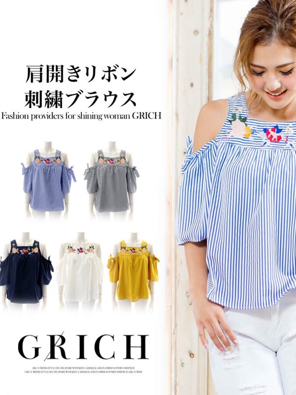 ビビットカラーの刺繍とリボンがレディ度をアゲル💋 肩開きリボン刺繍シャツブラウス 品番[170446] 1782円