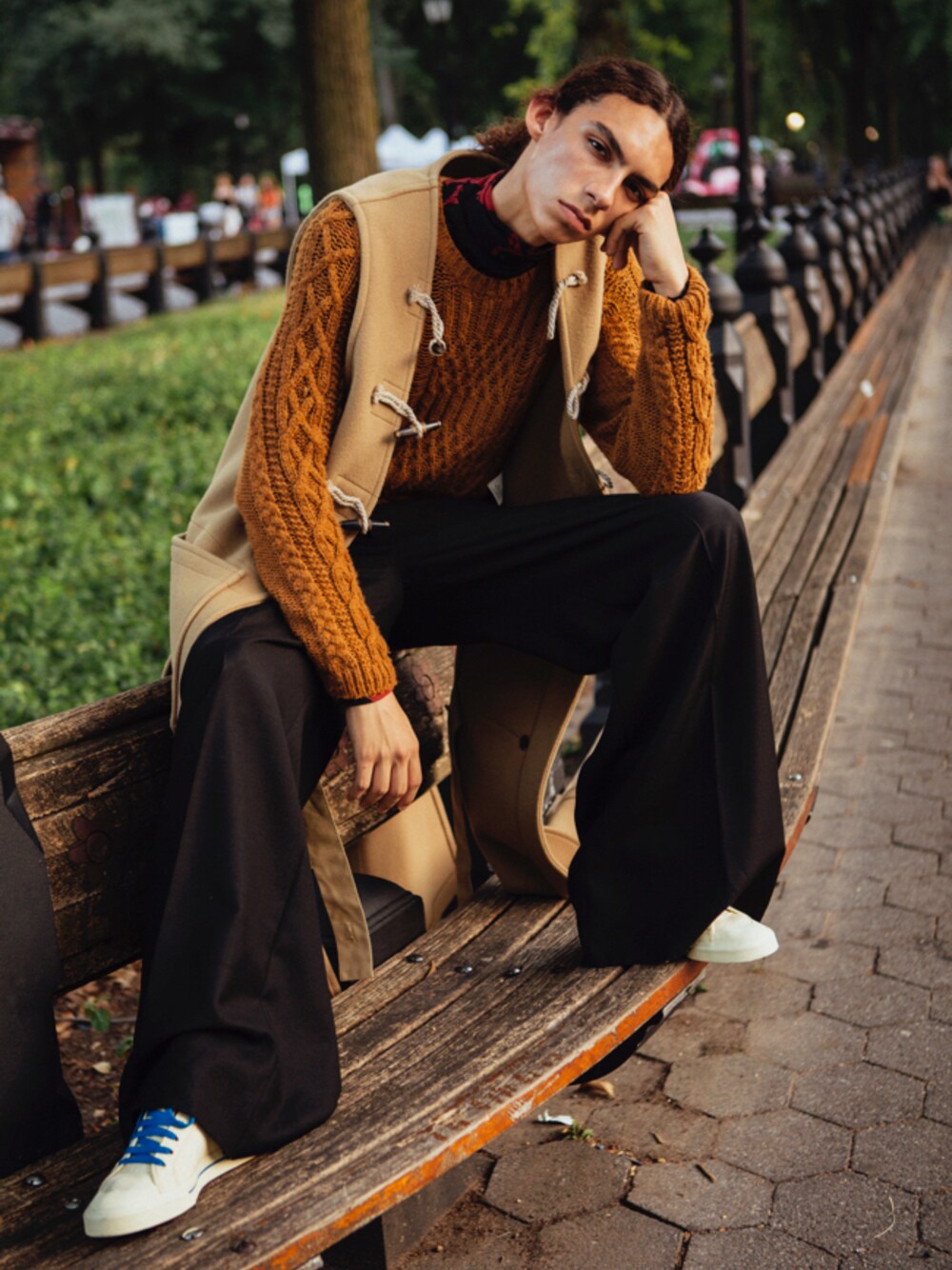 ダッフルジレ、キャメルニット、ハイネックトップ、ワイドパンツ/Maison Margiela スニーカー/adidas by RAF SIMONS
