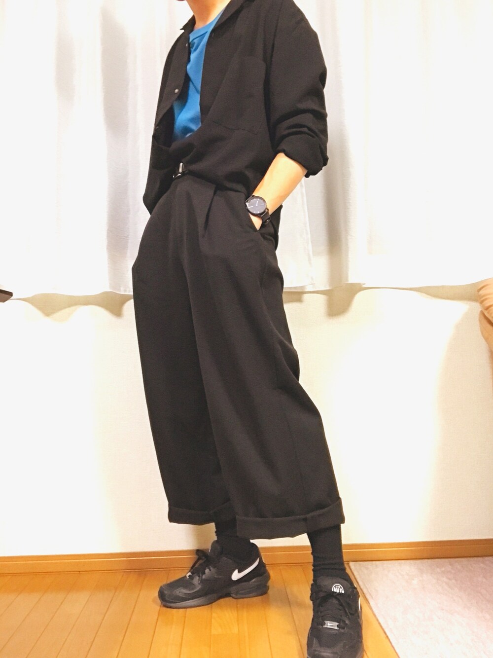また履いてしまった……。 歩きやすいしかっこいいしほんと気に入ってます ワイドスラックスをロールアップして黒と青で揃えてモード感出せたらなぁと思って着ました。結構満足です。