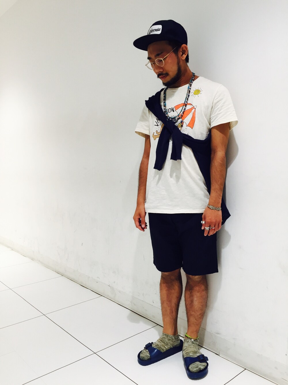 ネイビーのショーツはどんなコーデにも対応可能。着回しの王様。 半袖短パンにカーディガンのたすき掛けでコーデに肉付けしています。 grn全店では半期に一度のお得なSALEを開催中です。夏物おまとめ買いの大チャンスですよ♪