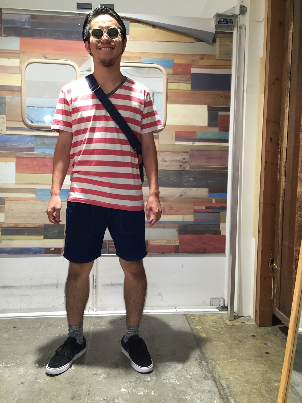 夏真っ盛りな天気には、夏真っ盛りなコーデで。 ピンクのボーダーteeにネイビーのショーツで元気なコーデです。 フェスにも良さそう!