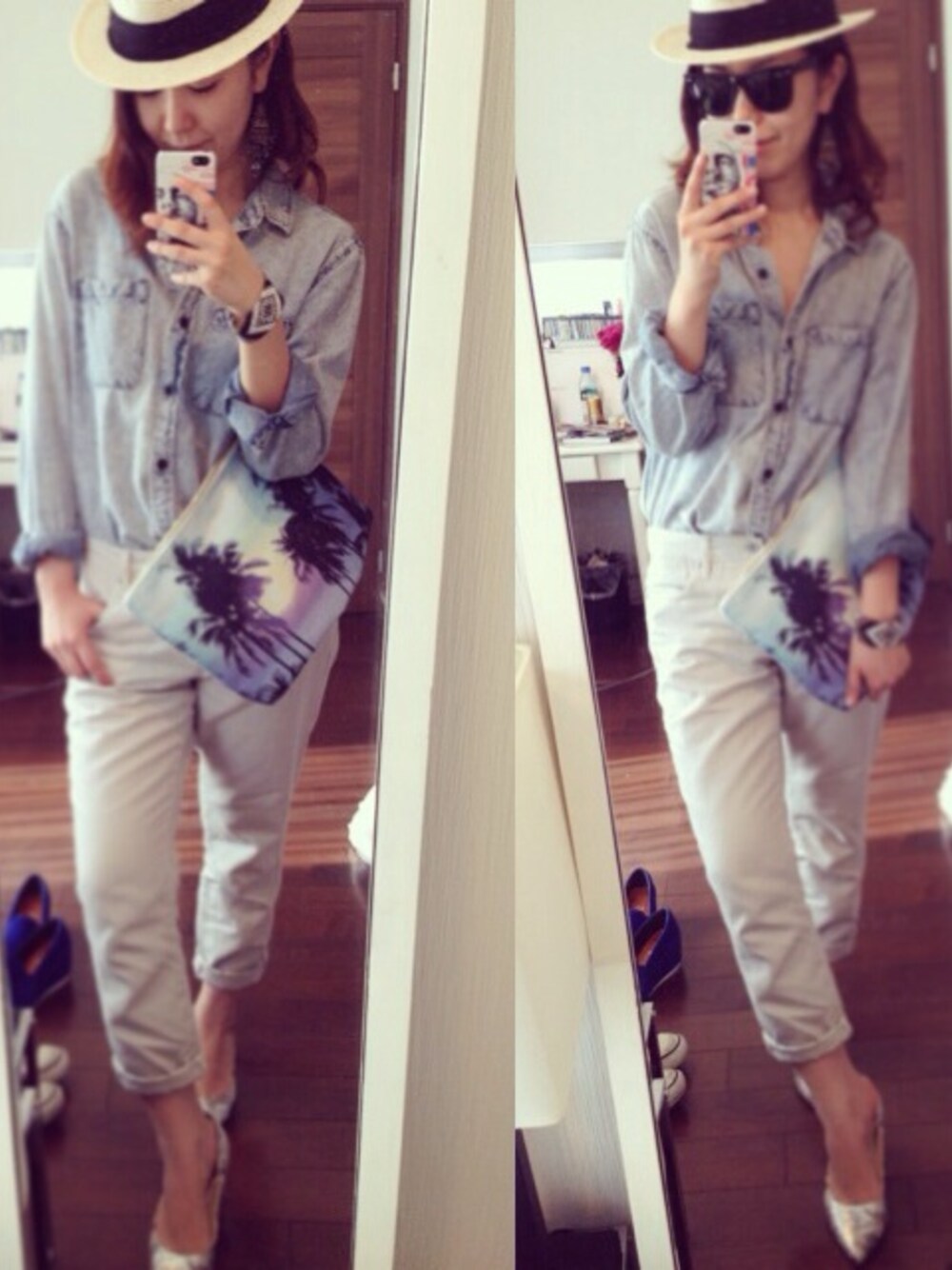 リゾート風ホワイトデニムスタイル。 もう少しあったかくなったらしたいな♡ クラッチバッグ、実はしまむら(笑)