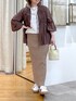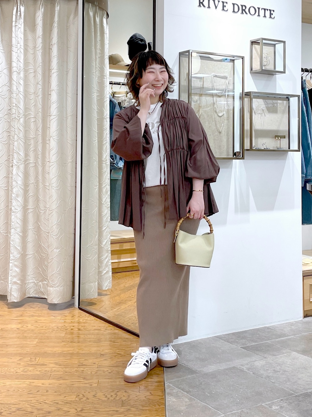 #158㌢ #骨格ストレート 【ブラウス】Fサイズ / ブラウン 甘すぎないドロストギャザーが印象的なブラウス! フロントのギャザーが 上半身をスッキリ見せてくれます◎ 袖口にはゴムが入っているので 袖もまくりやすくて快適! リボン結びでも素敵ですが、甘さが苦手な方は ひとつむすびのまま紐を垂らしたり そのまま結ばずに紐を垂らした状態でも こなれた雰囲気でお召しいただけます! 【スカート】38サイズ / モカ RIVE DROITEで大人気のリブスカート! 厚手の生地で下着や身体ラインを拾いにくく 伸縮性があるのでストレスなく着用できます◎ 36サイズでも着用できますが、パンツくらいの丈感の38サイズで着用しております! 【シューズ】【バッグ】店舗限定セレクトアイテム