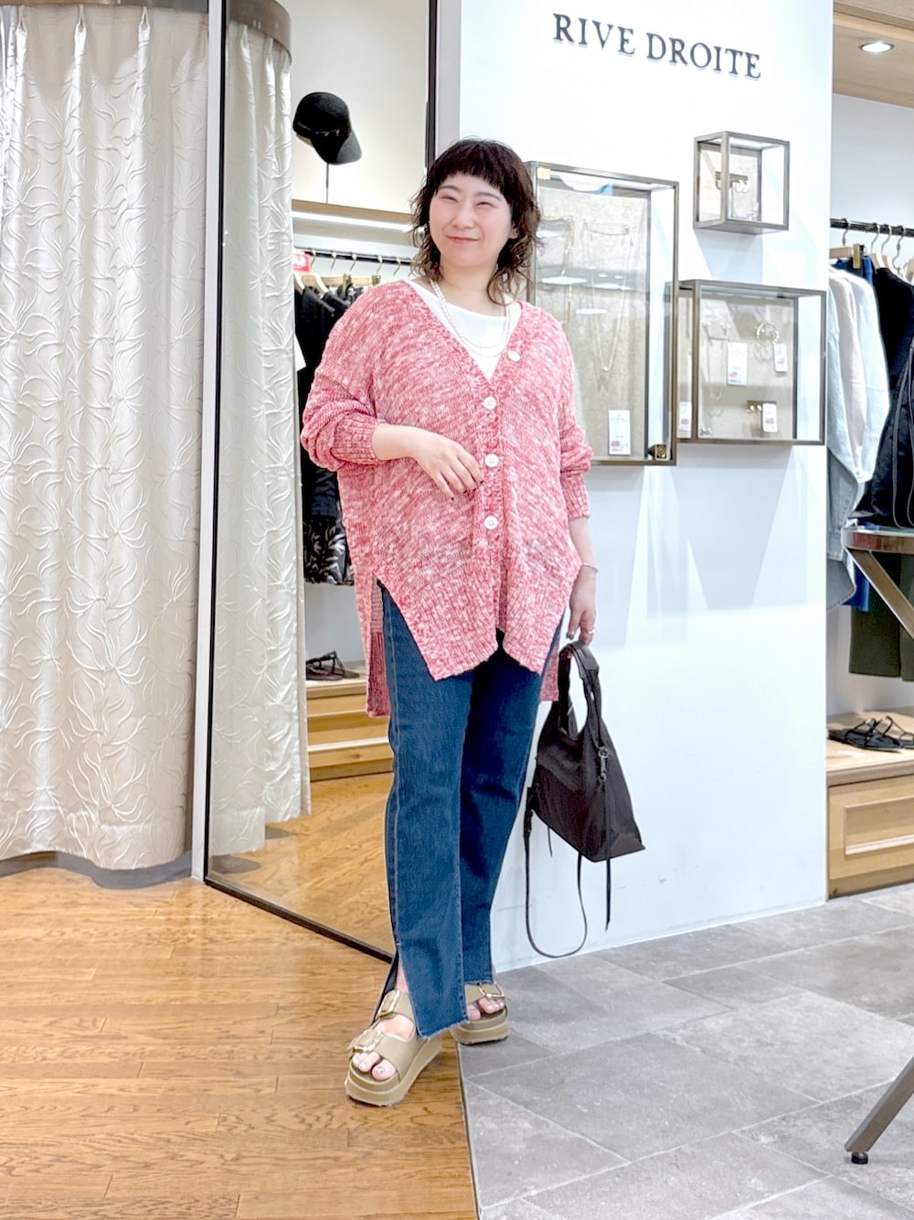 #158㌢ #骨格ストレート 【カーディガン】Fサイズ / レッド 毎年人気のサイドスリットカーデが 素材を変えてリニューアル! 前後2WAYで着用OK 通気性の良い素材で春・夏・秋と インナー次第でロングシーズン着回しできる 着痩せカーディガンです◎ ※サイズは昨年までのサイドスリットカーデと同じですが、自重が違うので着用丈が短く感じられる可能性があります 【タンクトップ】Fサイズ / オフホワイト リラックス感のある大人タンク! カジュアルすぎず、1枚でもインナーでも着回せる万能トップスです! 程よくゆとりのあるシルエットで、肩まわりもラクに◎ 首元はボートネック仕様で、デコルテをきれいに見せてくれます! ラウンドヘムでインしなくてもバランス良く着られるのも嬉しいポイント! 色違いでレイヤードして楽しむのもおすすめです! 【デニム】Lサイズ / ネイビー MONN定番ボトムのslitDENIMに ストレッチ入りバージョンが登場! すっきりとした美しいシルエットながらも ストレッチ素材で動きやすさ抜群◎ 美脚見え間違いなしなおすすめデニムです! ※定番のslitDENIMよりもコンパクトなサイズ感です 【サンダル】Lサイズ / ベージュ タウンユースにもぴったりな、デザインサンダル! 程よい厚底とWバックルの存在感が、足元にアクセントをプラス◎ カジュアルすぎず、女性らしさもキープできる絶妙なバランスが魅力です! 柔らかいソール&太めのストラップでフィット感があり、歩きやすさも抜群! フレアスカートやワンピースの“はずしアイテム”としてもおすすめです! M:23.5cm ピッタリフィット L:24.5cm 若干ゆとりあり