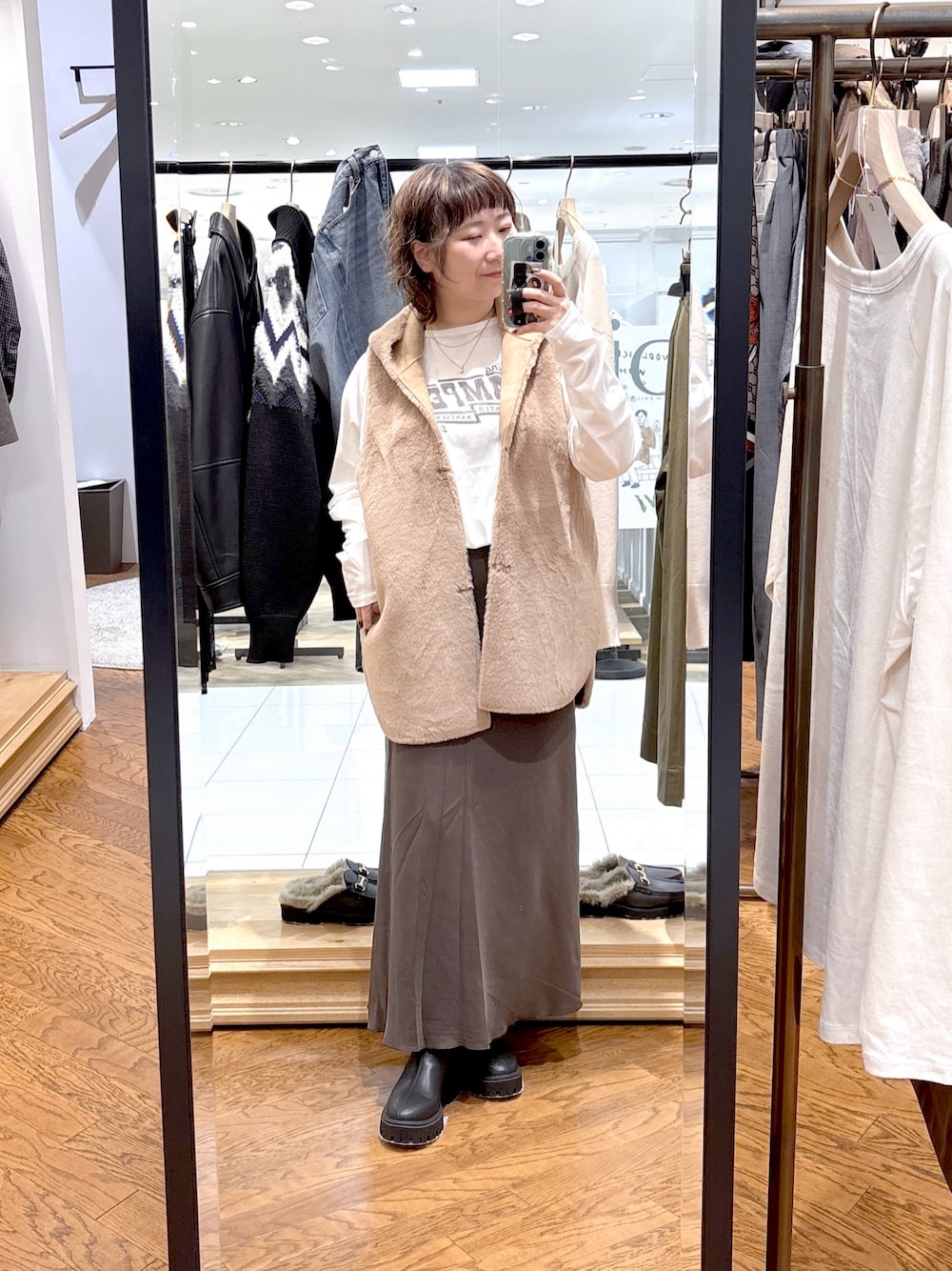 #158㌢ #骨格ストレート 【ファーベスト】Fサイズ / モカ 存在感のあるフードとファーがポイントのリバーシブルジレ! ゆとりのあるアームホールでオーバーサイズシャツから厚手ニットまでレイヤードしやすくなっています! 着ぶくれしにくい肉感でアウターの中にも仕込みやすくシーズンを通して汎用性の高いアイテムです! 【ロゴTee】Fサイズ / オフホワイト ヴィンテージ風ロゴがポイントのロンTee! 程よい抜けのネックラインとラグランスリーブで肩まわりスッキリ! 二の腕も余裕がありました◎ 【スカート】38サイズ / ブラウン 上品にスタイルアップできる、バイヤスフレアスカート! ウエストは総ゴムで、裏地もついており、楽してキレイが叶います◎ ツヤのある素材で、カジュアルやキレイめ、幅広いテイストのトップスとの相性抜群! ロングシーズン着用いただける、スッキリ見えスカートです! 【ブーツ】38サイズ(24.5cm) / ブラック スタイルアップ効果抜群のサイドゴアブーツがリバイバル! かかと部分にジップがついており、脱ぎ履き楽ちん◎ 足首に沿うようなデザインで、スッキリ見え&ボトムの合わせやすさ抜群! ※37サイズで薄手の靴下で丁度良いサイズです、38サイズは厚手の靴下で丁度良いサイズです。 ※普段は23.5〜24.0cmで靴を選んでいます