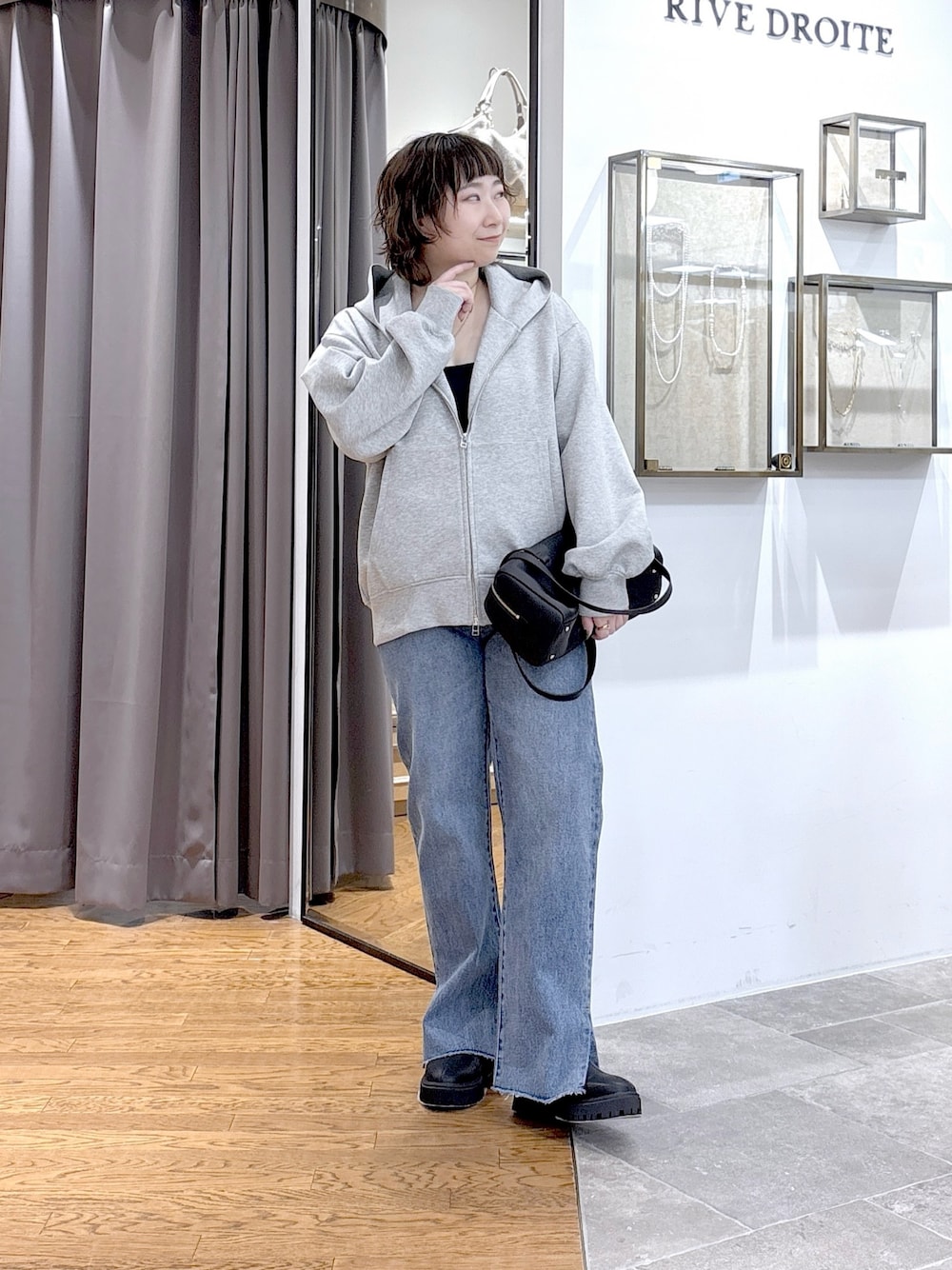 #158㌢ #骨格ストレート 【パーカー】Fサイズ / ライトグレー ゆったりとしたシルエットでありつつ、柔らかい生地で体になじむパーカー! 大きめフードで顔・肩周りがスッキリ見え! ふわんとした袖と、バックボリュームデザインでお洒落に決まります◎ 【デニム】38サイズ / ブルー 全骨格美脚見えと名高いslitDENIM! キレイなストレートラインで、足元のスリットは抜け感を演出してくれます! カジュアルにも、キレイめMIXにも着回し力抜群なワードローブに1本は欲しい MONN.:.の名品デニムです! 【ブーツ】38サイズ(24.5cm) / ブラック スタイルアップ効果抜群のサイドゴアブーツがリバイバル! かかと部分にジップがついており、脱ぎ履き楽ちん◎ 足首に沿うようなデザインで、スッキリ見え&ボトムの合わせやすさ抜群! ※37サイズで薄手の靴下で丁度良いサイズです、38サイズは厚手の靴下で丁度良いサイズです。 ※普段は23.5〜24.0cmで靴を選んでいます