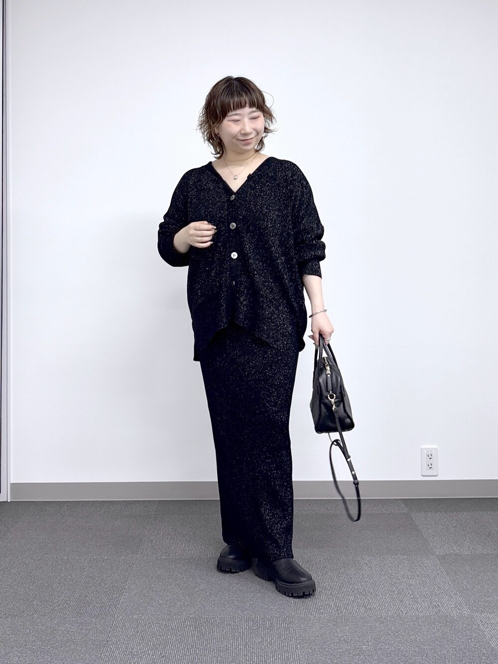 #158㌢ #骨格ストレート 【カーディガン】Fサイズ / ブラック 着るだけで華やぐラメニットカーディガン! 程よいルーズシルエットと、サイドスリットで体のラインを拾いにくいのが嬉しいポイント! 前後2WAYで着用OK◎ セットアップでも、他のボトムスとも合わせやすく着回し力の高いおすすめアイテムです! 【スカート】38サイズ / ブラック 足のラインをスッキリ見せてくれるラメニットスカート! リブニットで伸縮性が高くストレスフリーな着心地◎ セットアップでも、他のニットやブラウス、スウェットとも合わせやすく 秋冬活躍間違いなしのおすすめスカートです! 【ブーツ】38サイズ(24.5cm) / ブラック スタイルアップ効果抜群のサイドゴアブーツがリバイバル! かかと部分にジップがついており、脱ぎ履き楽ちん◎ 足首に沿うようなデザインで、スッキリ見え&ボトムの合わせやすさ抜群! ※37サイズで薄手の靴下で丁度良いサイズです、38サイズは厚手の靴下で丁度良いサイズです。 ※普段は23.5〜24.0cmで靴を選んでいます