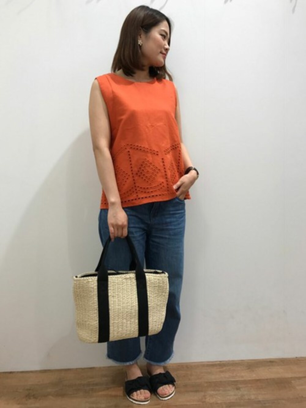 裾の刺繍がポイントのブラウスにトレンドのデニムボトムを合わせました。