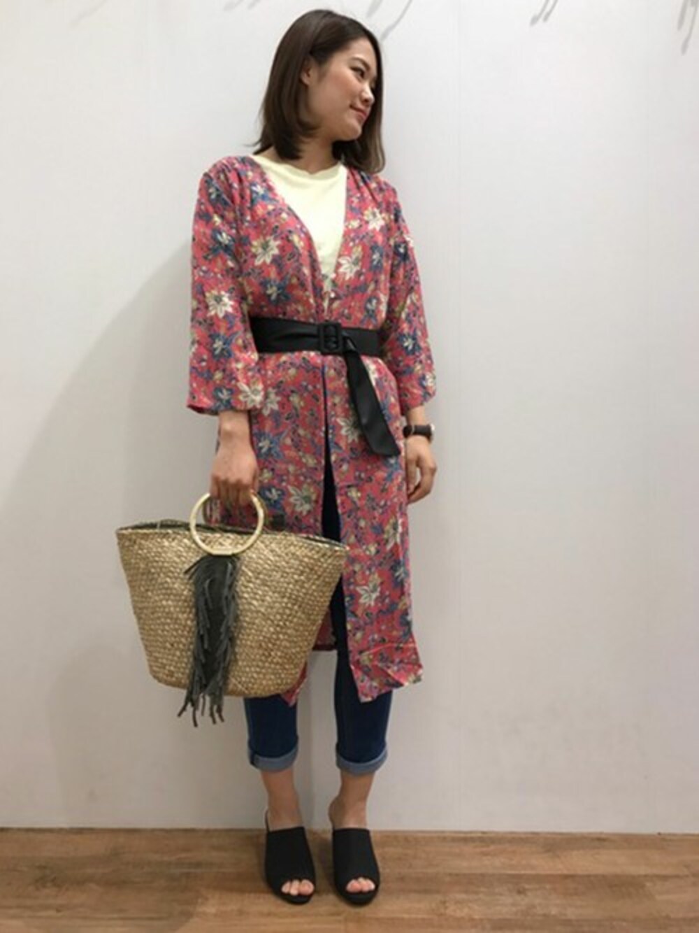 ボタニカル柄がかわいいガウンカーデはシンプルなTシャツにサッシュベルトを巻き今年らしいコーデ。