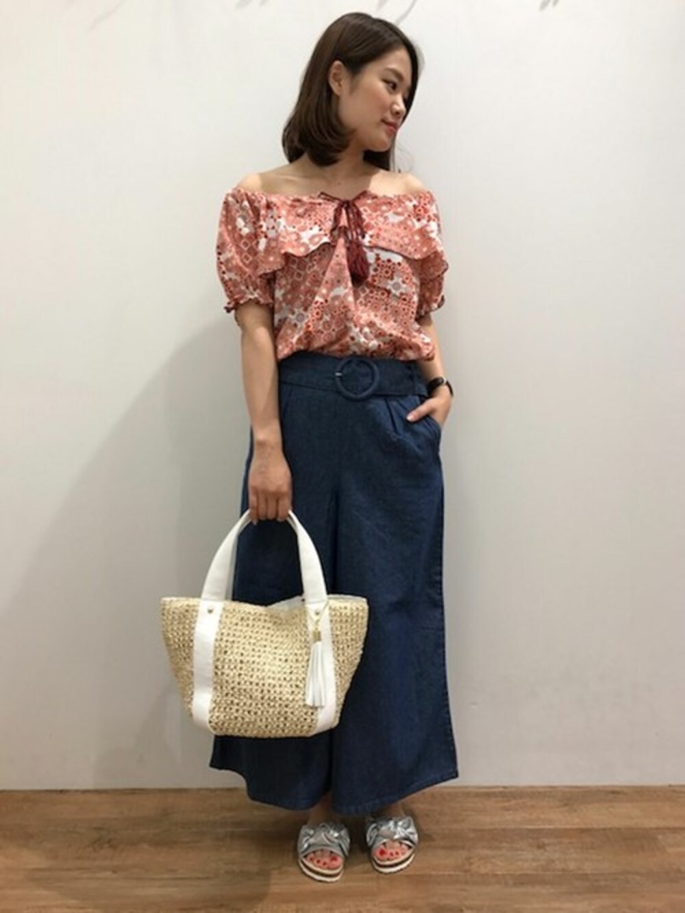 モロッコ柄のオフショルにベルトの丸カンがポイントのデニムを合わせた今年トレンドのスタイリング。