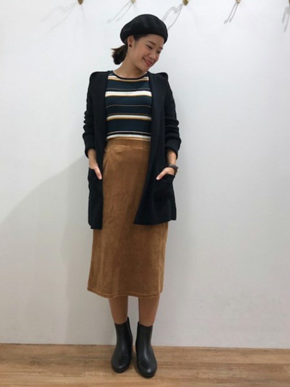 今年トレンドのベロア素材のタイトスカート。サイドゴアブーツと合わせカジュアルスタイル。